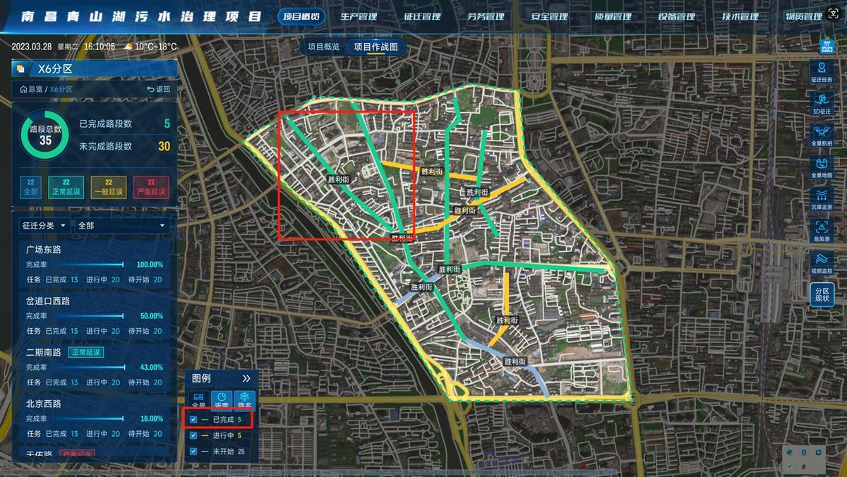 为此,项目团队制定了“青山湖作战图”,将每一条路按照计划、执行、反馈等环节反映到作战图,实现全员、全天候在线指挥、协同管理。