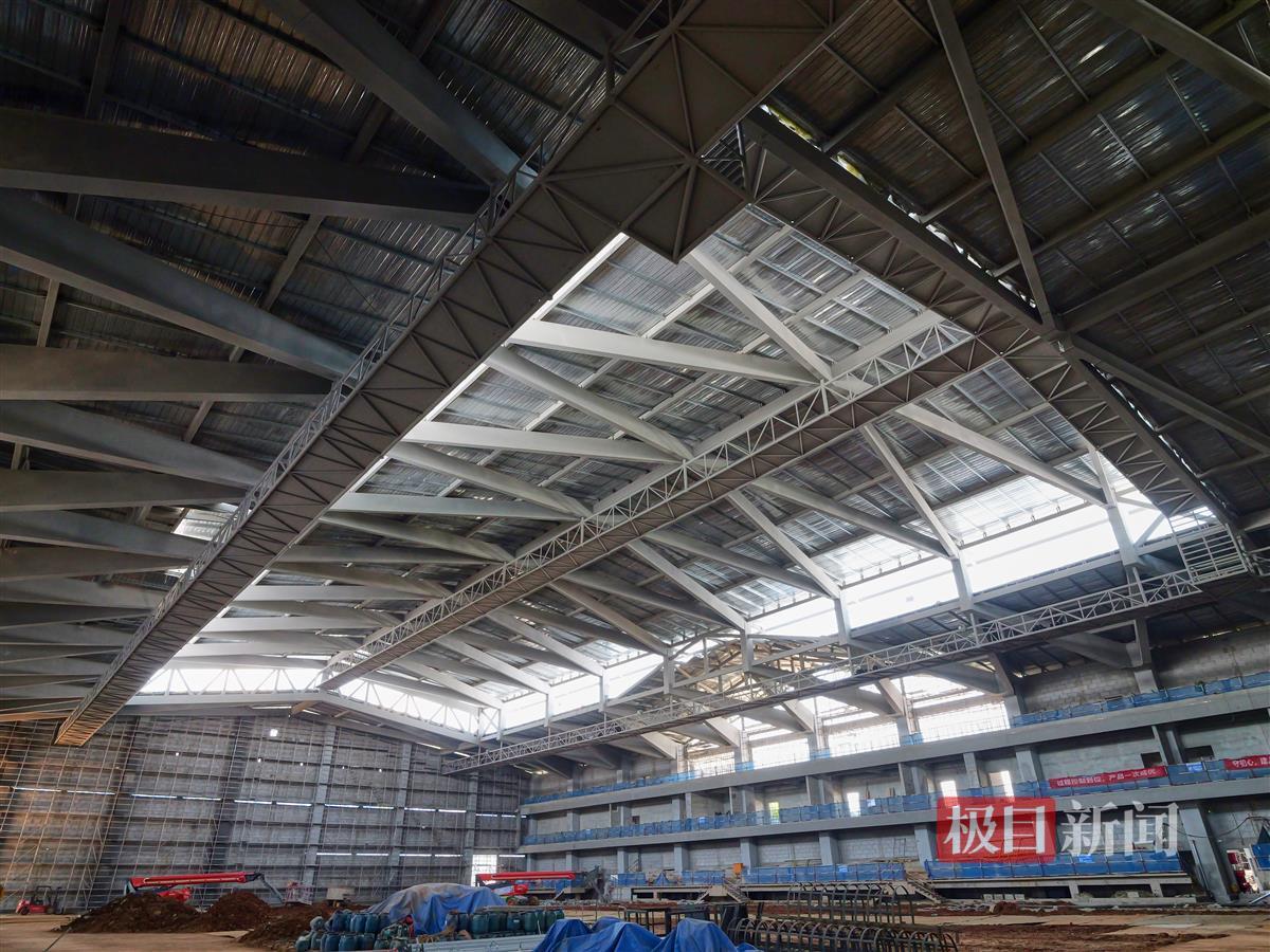 极目新闻记者在现场看到,钢结构主体工程已经合拢,施工人员正在紧张有序地搬运装饰材料。