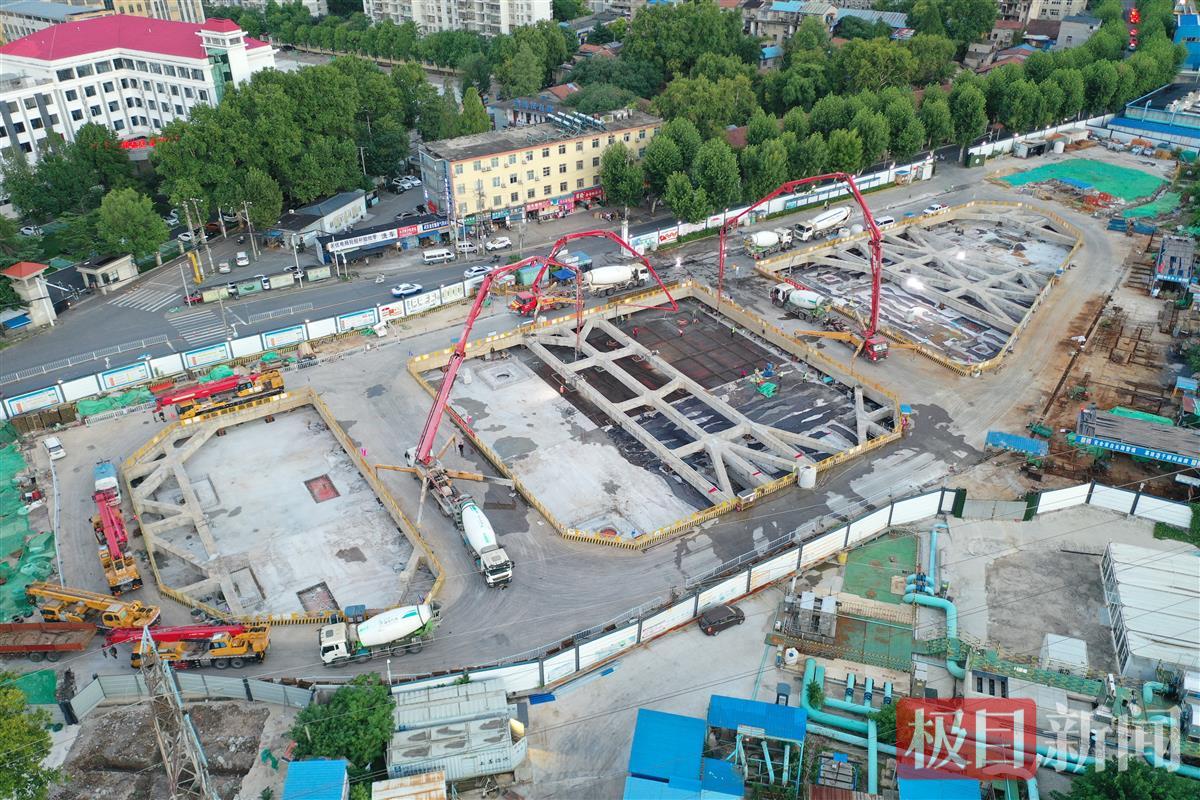 极目新闻记者看到,施工现场机器轰鸣,多台混凝土泵车正在加紧浇筑。“2号调蓄池为全地下结构,设计规模为12万立方米,最深处可达28.7米,相当于向地下开挖近10层楼的高度。”2#调蓄池项目负责人向波介绍,项目最大的难点在于基坑深,场地小,技术难度高,施工环境复杂。
