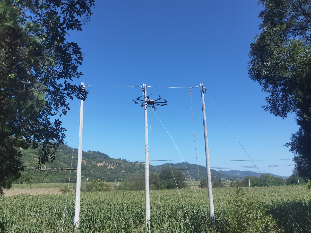 8月12日中铁电气化局西安电气化公司抢险作业人员在陕西富县受灾现场使用无人机牵引架线。于刚摄