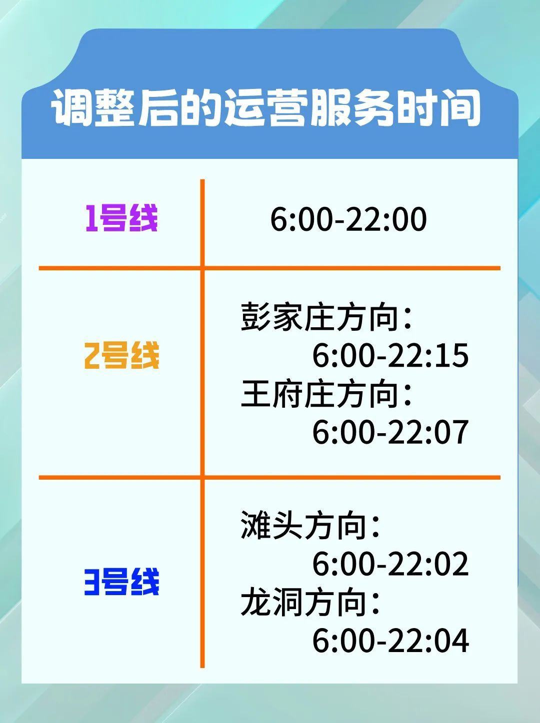 届时,线网各次列车到发时刻均有变化,各时段行车间隔均有调整,请您提前规划好行程。您可通过“济南地铁”APP、微信公众号等查询首末班车时间以及行车间隔。