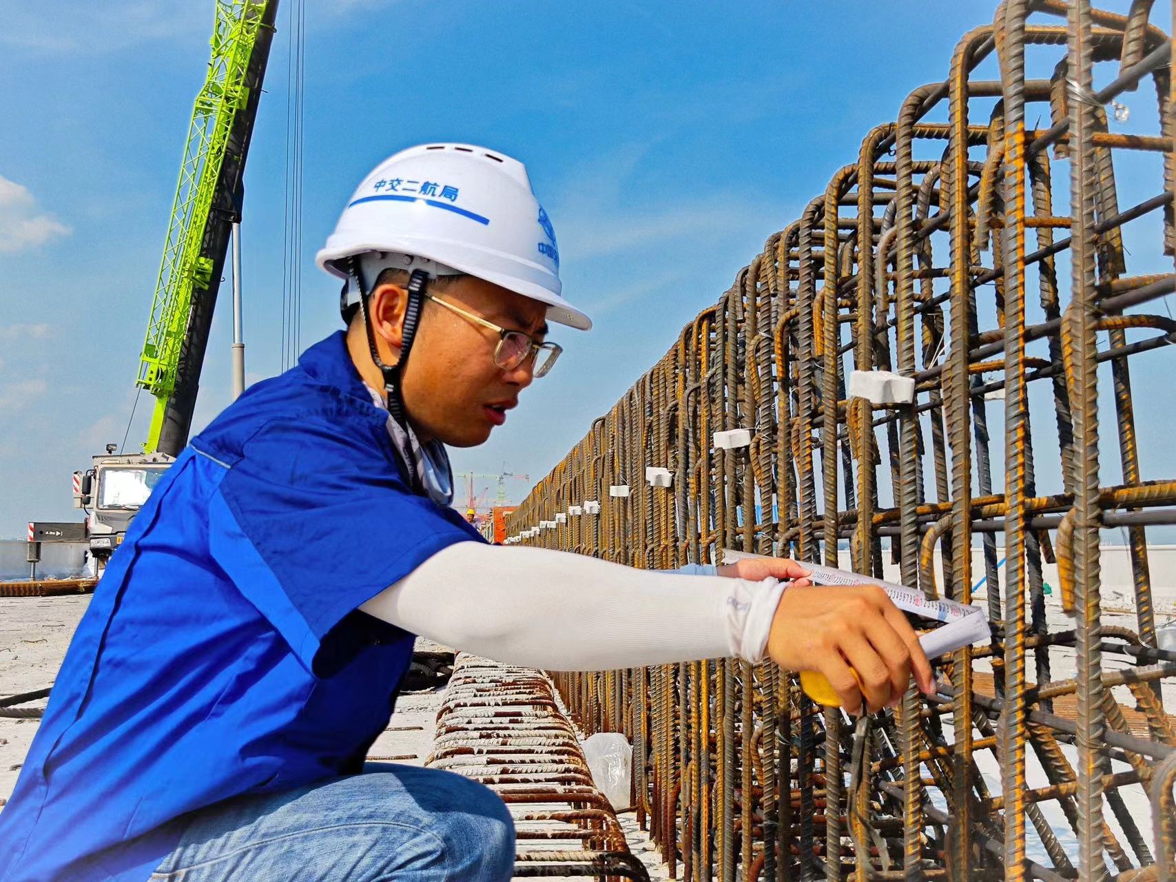 东引桥桥面距地面20米以上,已架设完成的1530米桥面在晴空之下一览无余,是整个项目离太阳最近的地方。项目部的技术员在现场值守时,只能依靠安全帽、冰袖、面巾等抵御烈日的直射,汗珠一颗颗从安全帽顺着黝黑的脸庞滚落,钻进早已湿透的衣服里。“一天至少要喝五六瓶水。”现场负责人朱翔在测量完护栏钢筋绑扎的间距后,便立即拿起水杯站起身猛喝起来。最早来到桥面的他在巡视完桥梁两端后,已是汗流浃背。