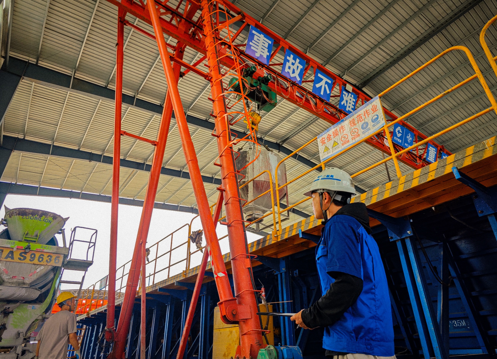 智慧梁厂的数字化生产设备使得单个箱梁的生产时间减少了67%,作业人员减少30%,从而避免了工人在高温下长时间、高强度、密集作业的情况,同时钢筋绑扎、混凝土浇筑等环节都在较为阴凉的环境下进行,使得整个生产流程始终安全、高效、有序。通过人、机、料各环节精心组织、过程严格控制质量、进度,东引桥项目已完成箱梁预制545榀,完成进度接近90%,为大桥躯干“成长”提供了强有力的支撑。