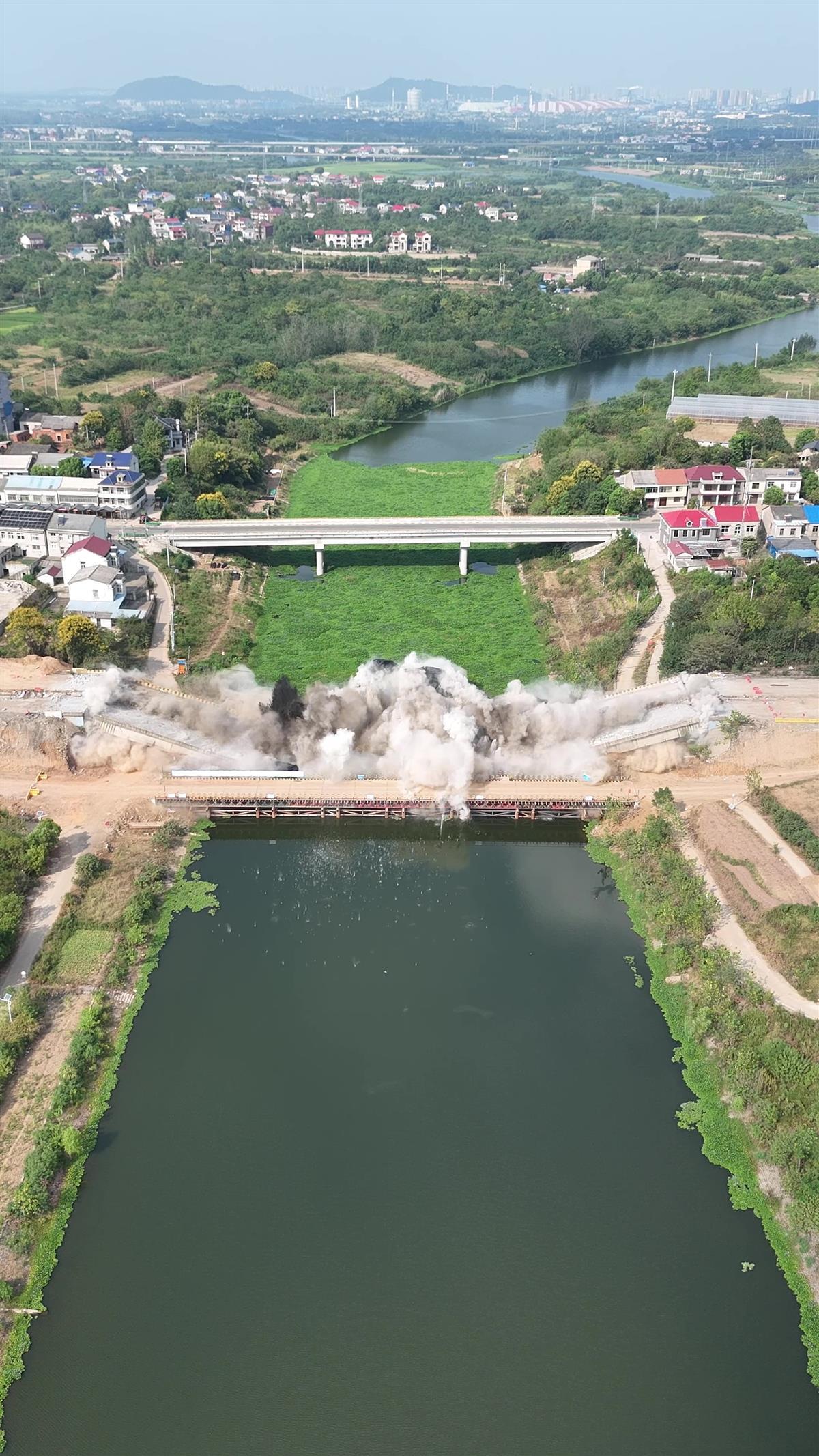 此次爆破的长岭大桥位于鄂州市鄂城区团结村和杨方村,东西方向横跨新港河,于1989年7月正式建成,大桥全长120米,由于老桥承载力和通行率不满足现行规范要求,现状通道净空也不能满足地方发展需要,爆破拆除重建迫在眉睫。