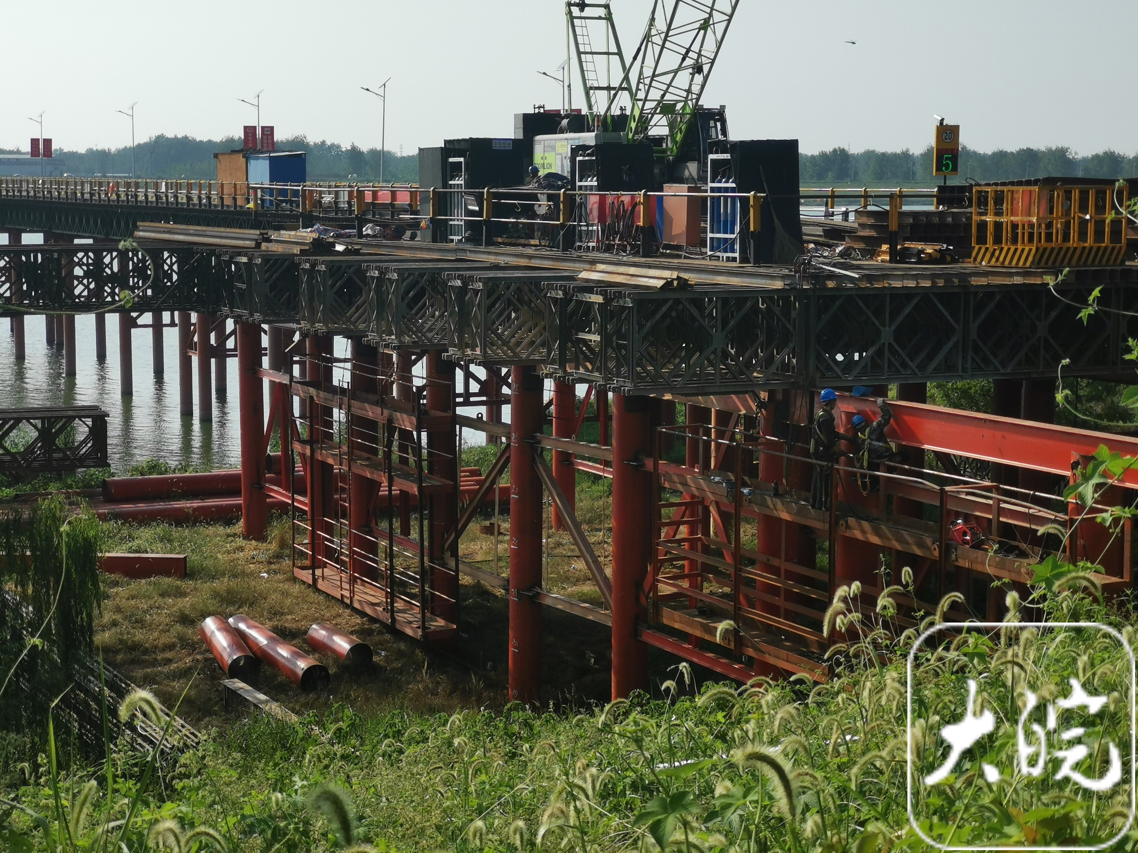 大皖新闻记者在距离施工现场岸边最近处看到,栈桥和栈桥南侧多个巨大的施工平台上,竖立着许多大型吊车和钻孔机等设备,远远看去,正在作业的钻孔机有两台,由于施工机器较多,河面上传来阵阵轰鸣声,有运输车辆在栈桥上缓慢移动。