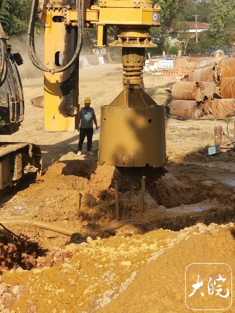 大皖新闻随后又来到一路之隔的淠河东岸引桥桥墩施工现场,这里有一台大型钻孔机正在进行钻孔作业。在轰鸣声中,巨大的钻头深入地下,等其再度抽上来时,带出来大量泥浆,然后堆放在一旁,由另一台挖机进行处理。大皖新闻记者看到,钻孔作业现场北侧还有一个钻孔,上面覆盖着格栅状金属物,进行了安全防护。