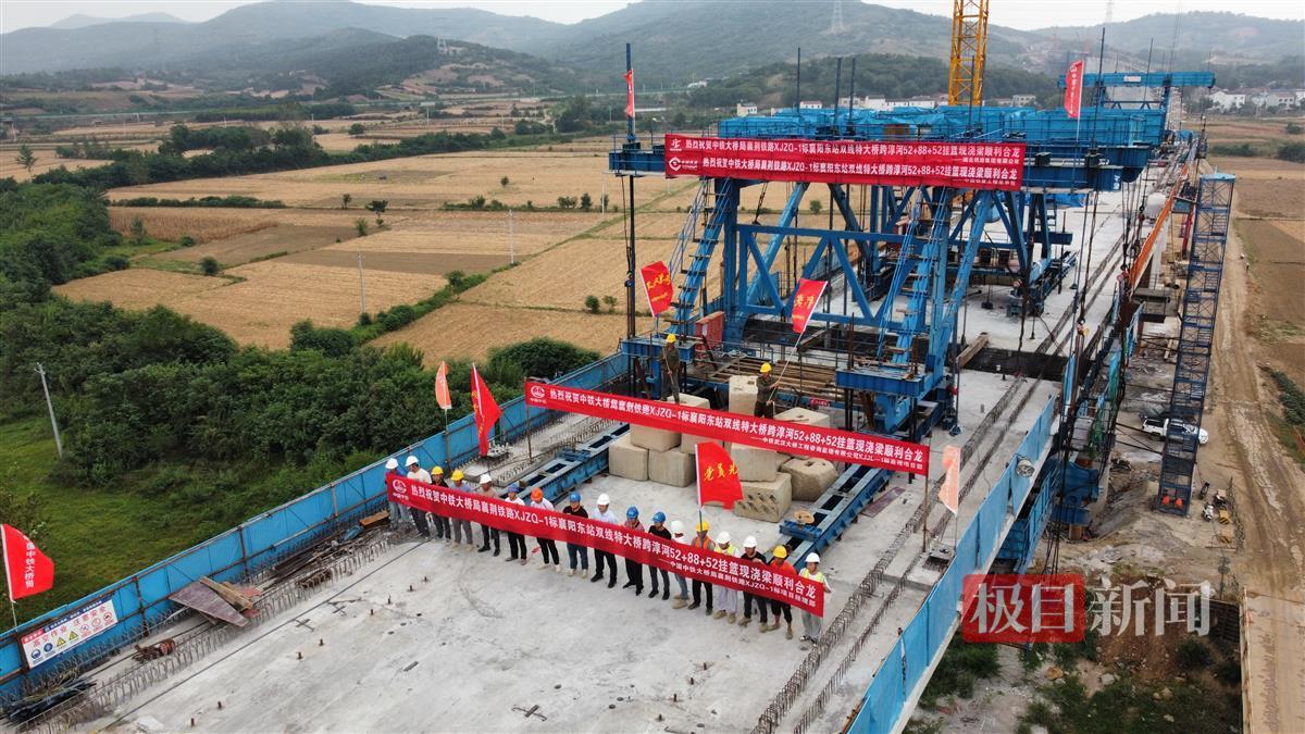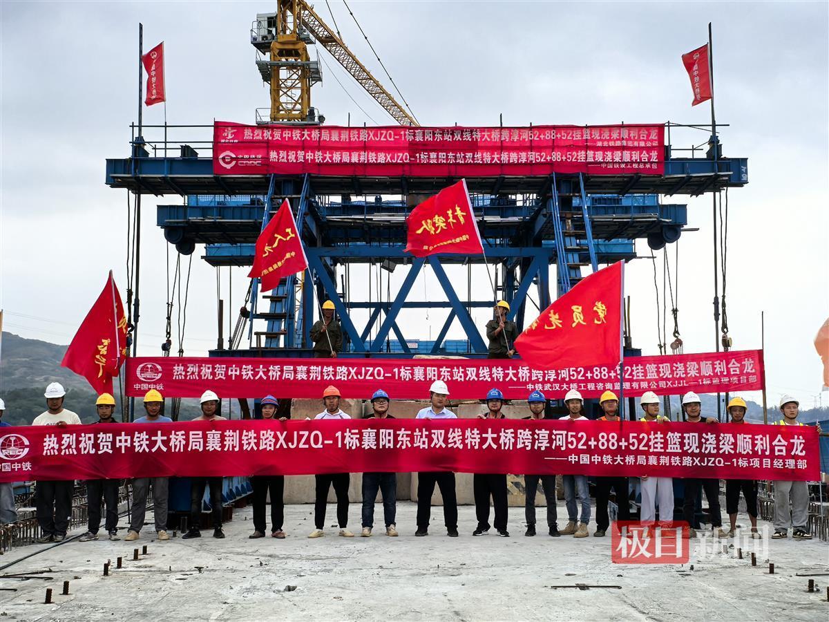 本次合龙的襄阳东站双线特大桥(52+88+52)米连续梁位于襄阳市东津镇境内,横跨汉江支流淳河,距襄阳东站7.6公里。
