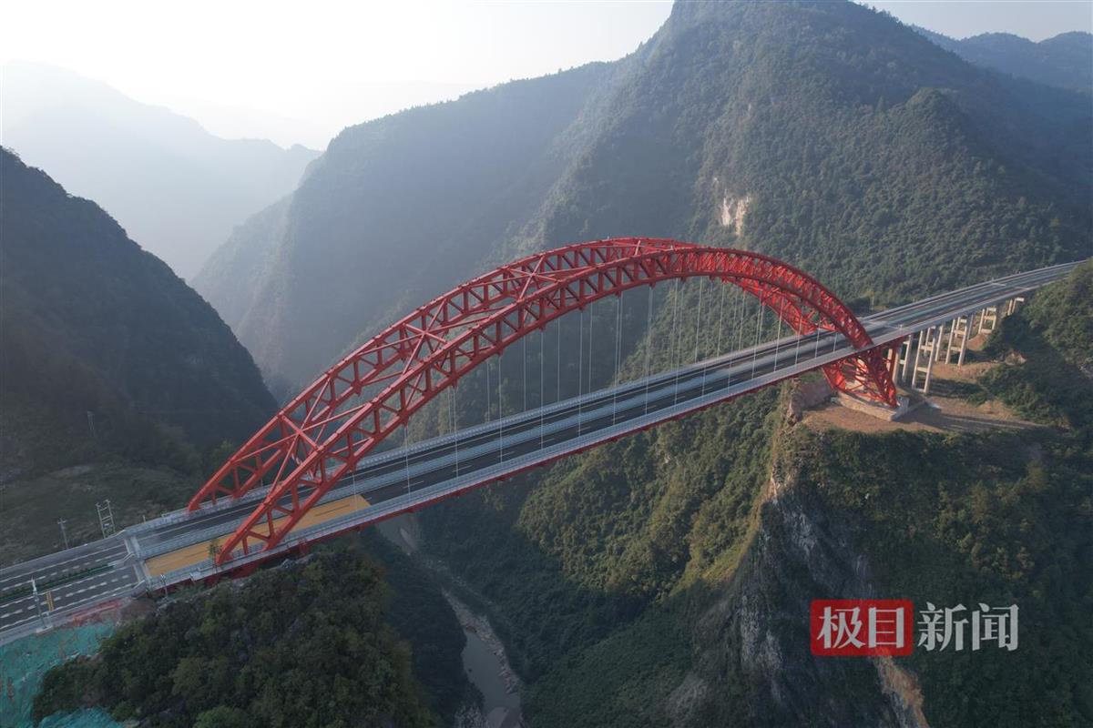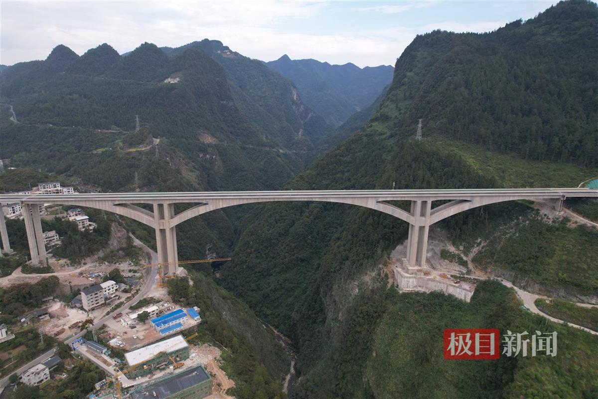 溇水河特大桥地处湖北省恩施州鹤峰县褶皱山地,横跨深度300多米U型峡谷,被称作宜来高速鹤峰东段最难啃的“硬骨头”之一。大桥全长328米,主桥为中下承式高低钢桁架两铰拱,采用“缆索吊机吊装+悬臂斜拉扣挂”的总体方案进行施工,桥面系采用钢混组合梁结构。从鹤峰县城里看去,大桥恰似一道“彩虹”。
