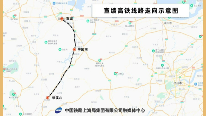 10月11日9时,首趟始发列车G9298次从宁国南站出发驶向宣城站,12时52分到达终点站上海虹桥站,宣绩高铁正式开通运营,宣城实现县县通高铁。宣绩高铁位于安徽省宣城市境内,正线全长115公里,设计时速350公里,设宣城、宁国南、绩溪北3座车站,其中宁国南站为新建车站。