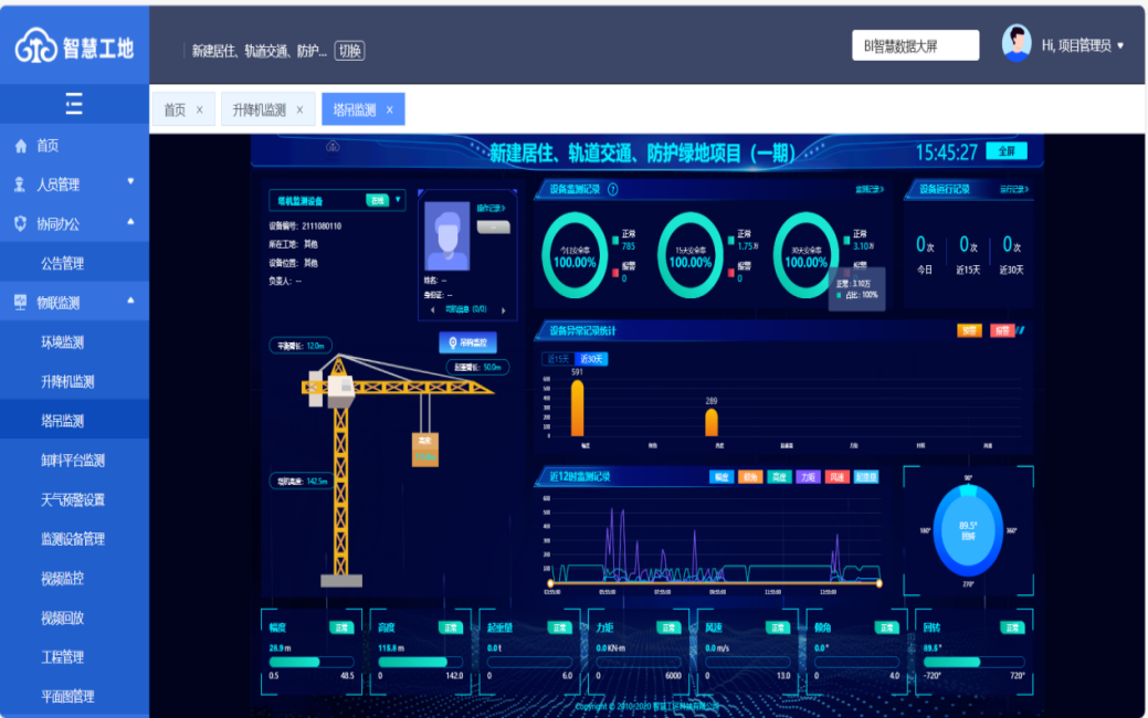 项目安全生产标准化防护措施落实到位,运用塔吊监测、吊钩可视化、升降机监测、数字化安全教育、智能AI识别等多项智慧工地模块,提升安全防护效果。