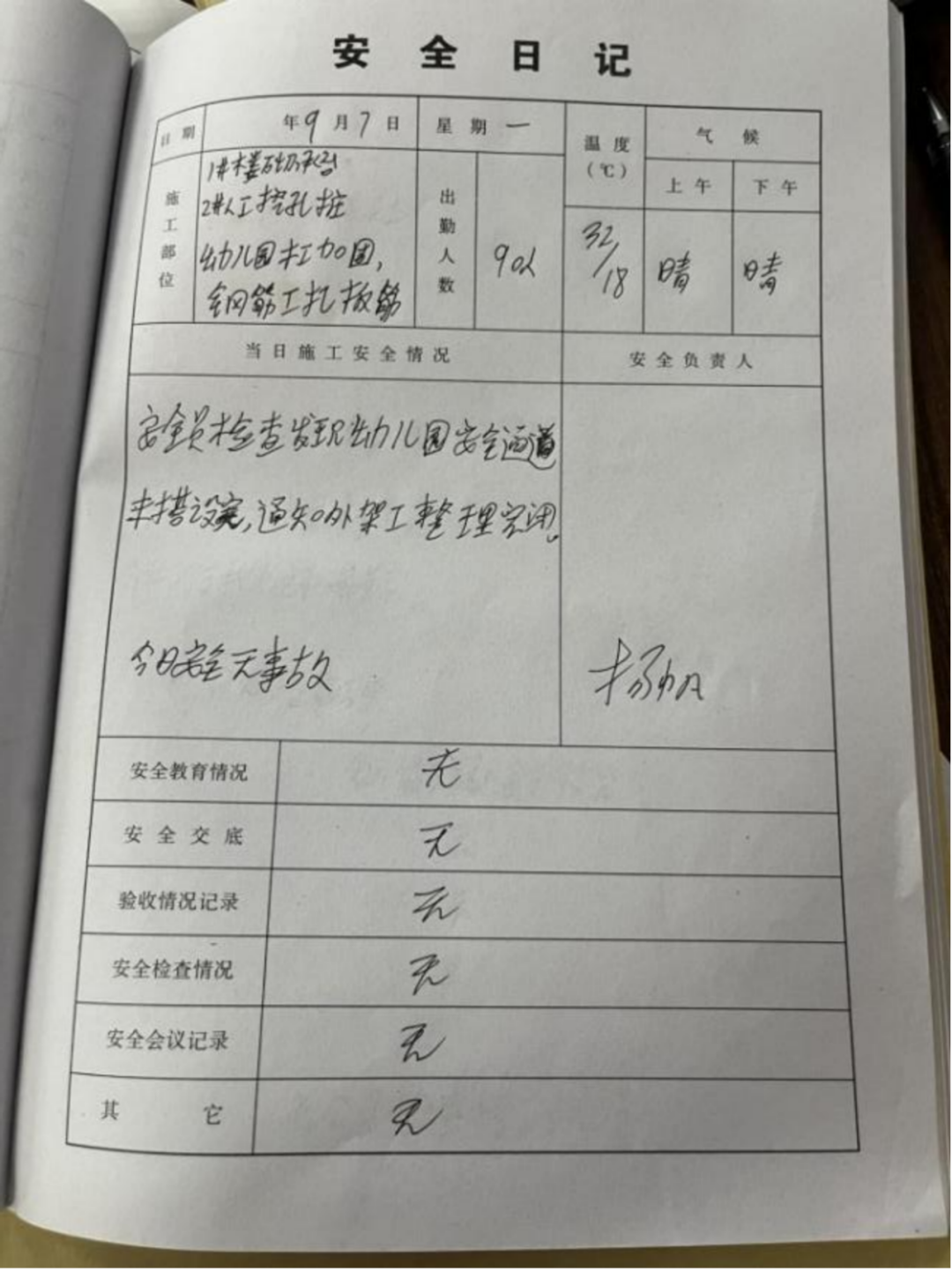 检查期间,项目经理、监理总监、专职安全员均未在岗。安全日志填写不规范、签章不全。安全员未佩戴使用检查记录仪,隐患排查走形式,现场消防、用电、安全防护隐患突出,部分特种人员证照失效。