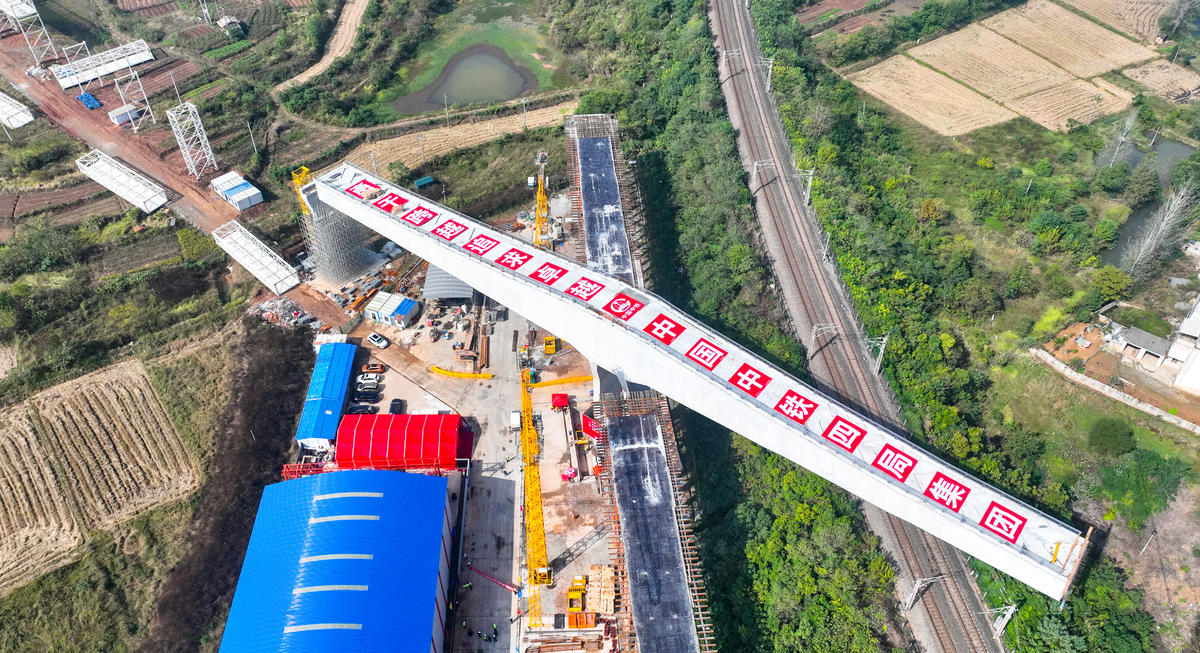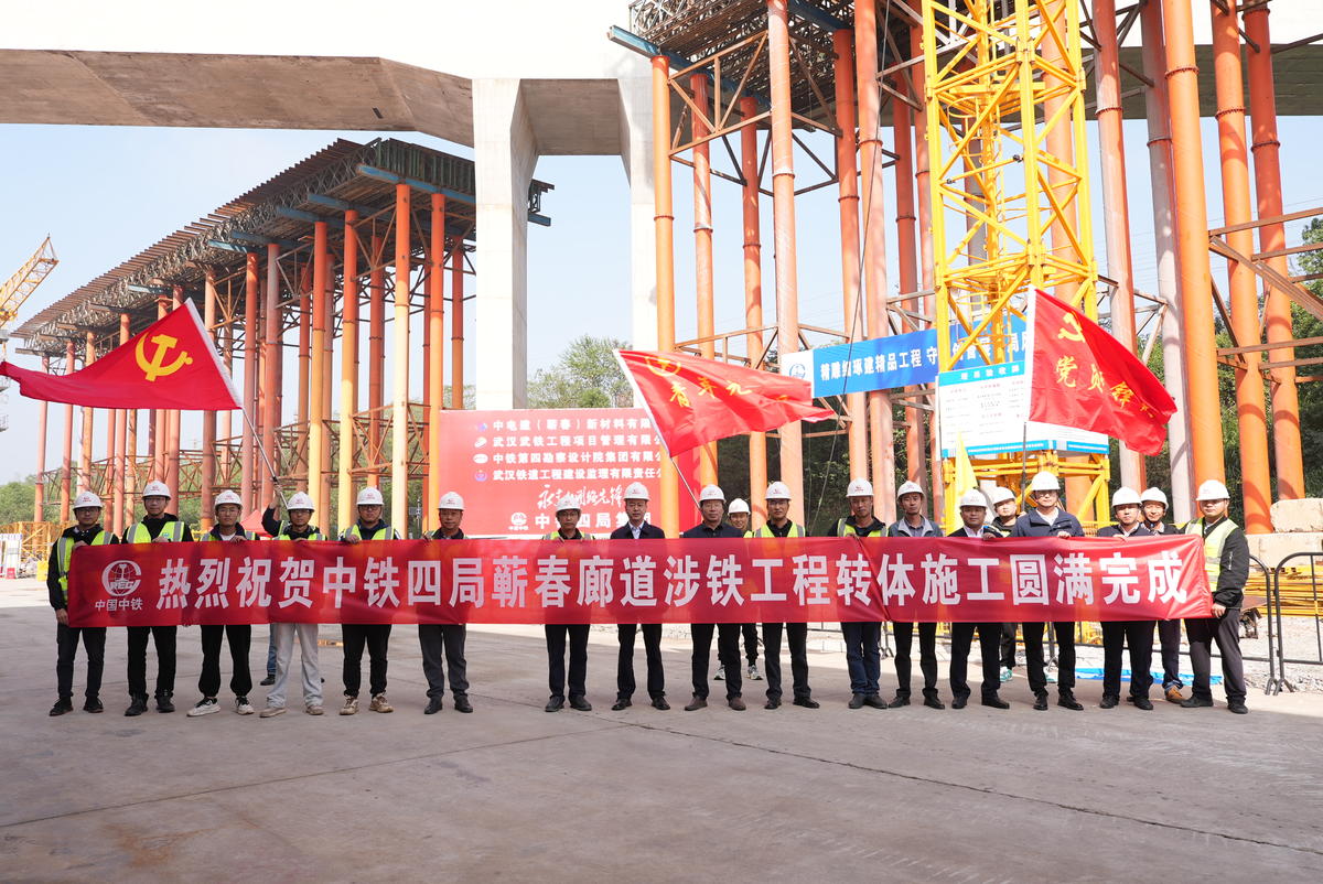 10月23日上午,由中国铁路武汉局集团有限公司项目管理公司代建,中铁四局承建的国内首例倒置连续梁——湖北省蕲春县长胶廊道上跨京九铁路大桥的转体梁,在逆时针旋转47度后精准就位,顺利在空中“华丽转身”跨越京九线。