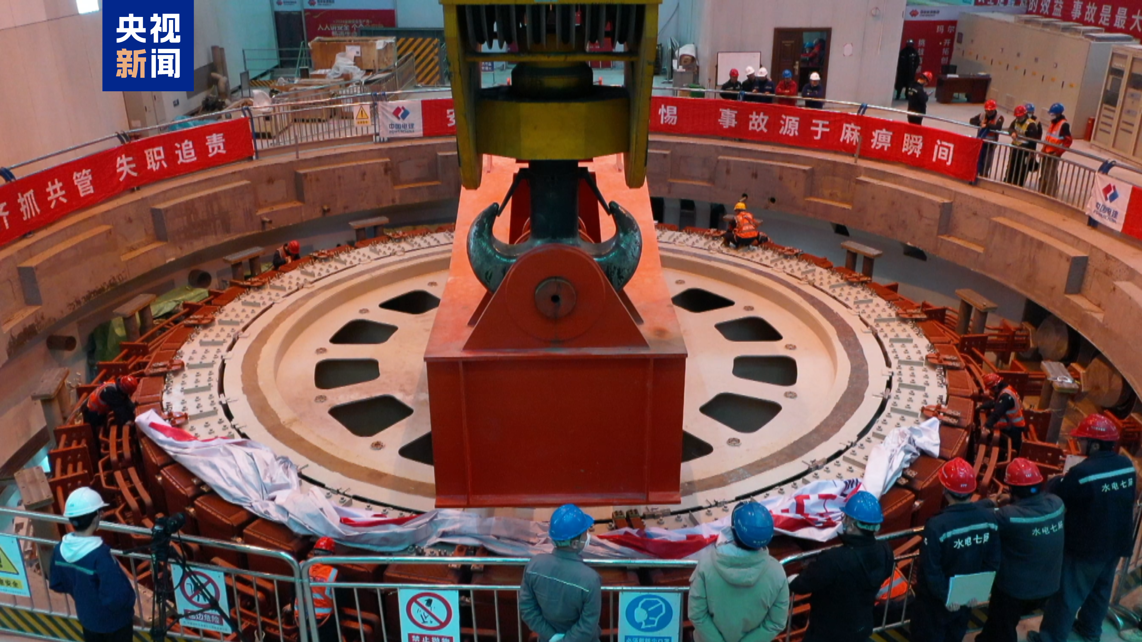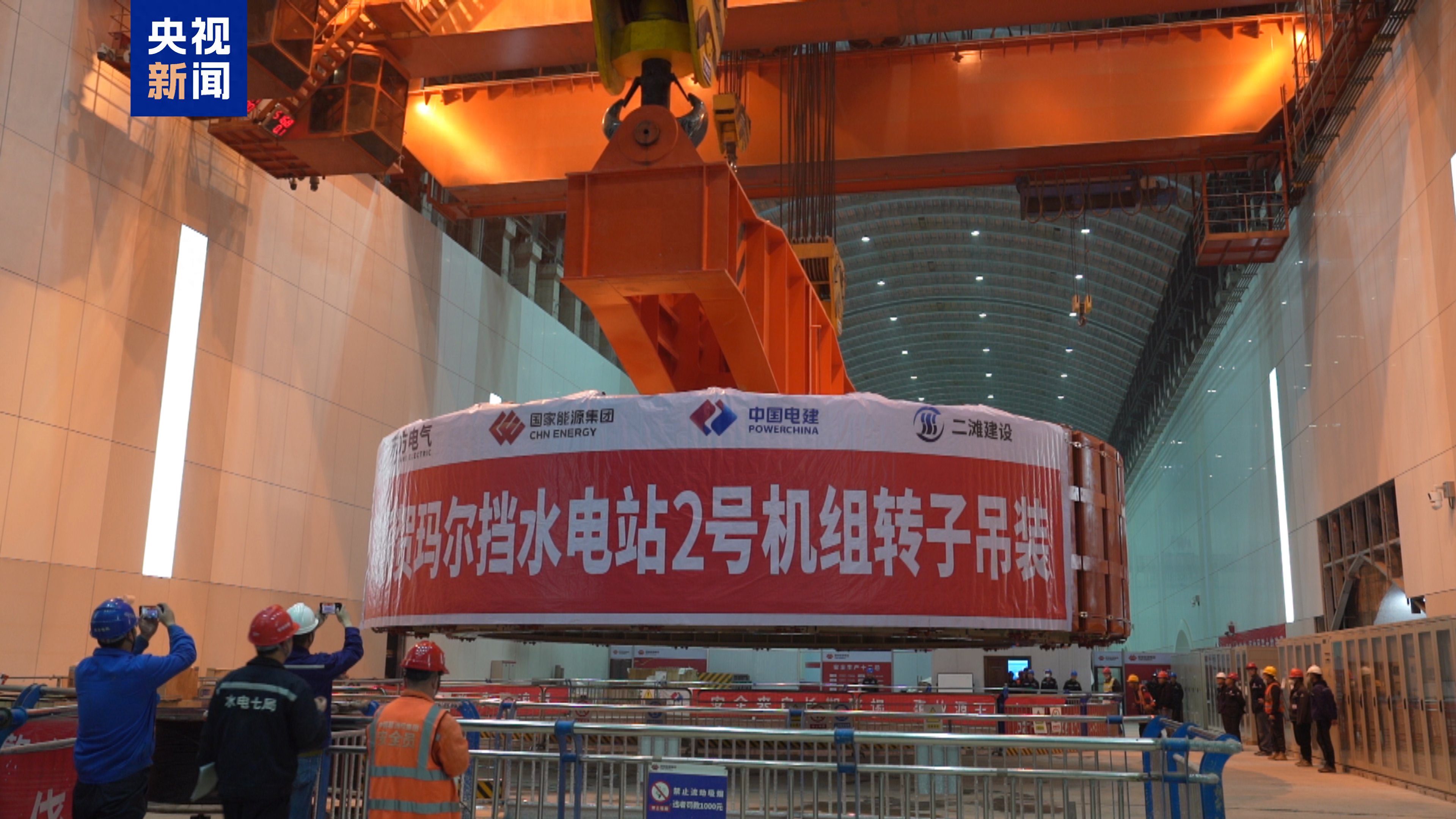 该电站2号机组转子由转子支架、磁轭片及磁极等主要部分组成,组装完成后外圆直径约12.8米,最大高度约3.08米,起吊总重达1050吨,是水轮发电机组安装过程吊装重量最大的部件,也是直接影响机组长期、安全、稳定运行的核心部件。为此,施工团队重点把控转子支架焊接工艺、磁轭片叠装质量以及转子圆度偏差,实现组装安装验收一次合格。同时,优化吊装专项方案,确保了转子一次性吊装就位。