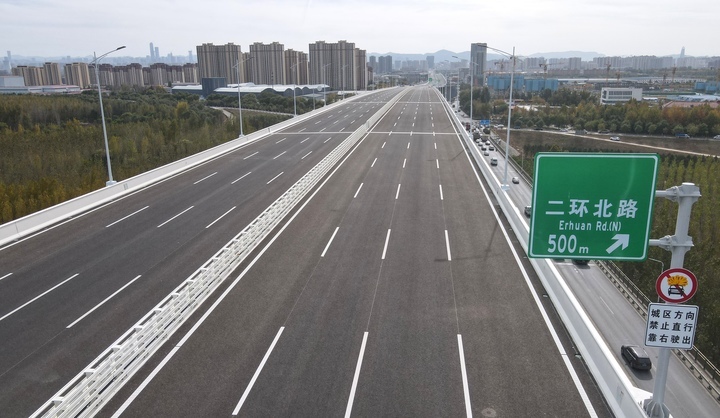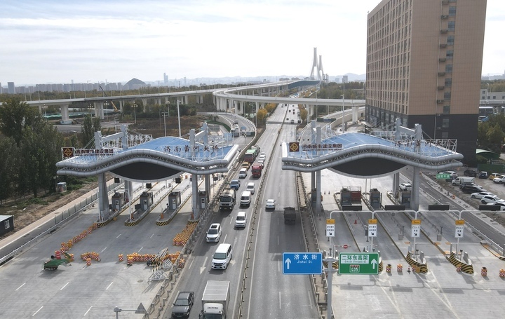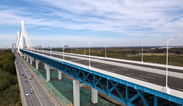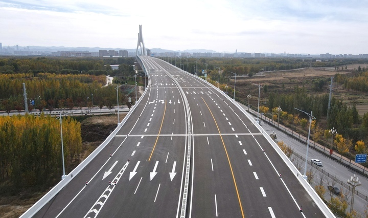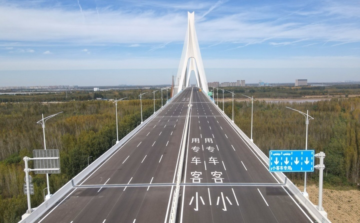 11月4日,在G104京岚线济南黄河公路大桥施工现场,大桥主桥沥青层面铺设完成,交通标识线、道路指引标识牌及路灯等交安设施的施划安装也基本结束,黄河北岸的匝道桥及收费站主体施工全部结束,双向八车道的大桥展现新颜,正全力冲刺年底通车目标。
