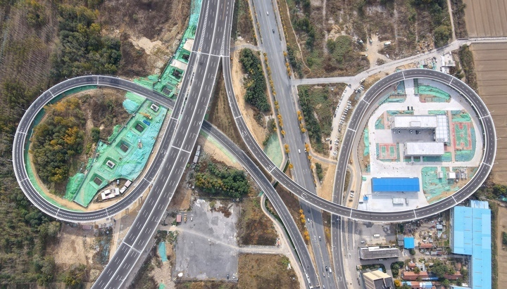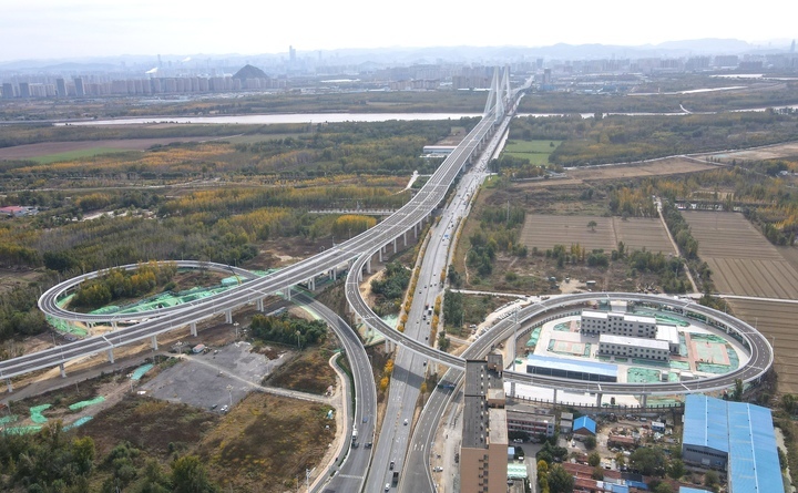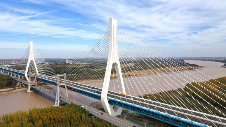 G104京岚线济南黄河公路大桥总长2518米,主桥长1028米,最大跨径488米,桥宽37.5米。新桥与老桥并桥建设,新老桥桥面高差24米,中心间距33.5米,是黄河上第一座不等跨并桥建设工程,也是黄河上跨径最大、钢桥总长最长的公轨分层合建桥梁,刷新“跨黄”桥梁纪录。