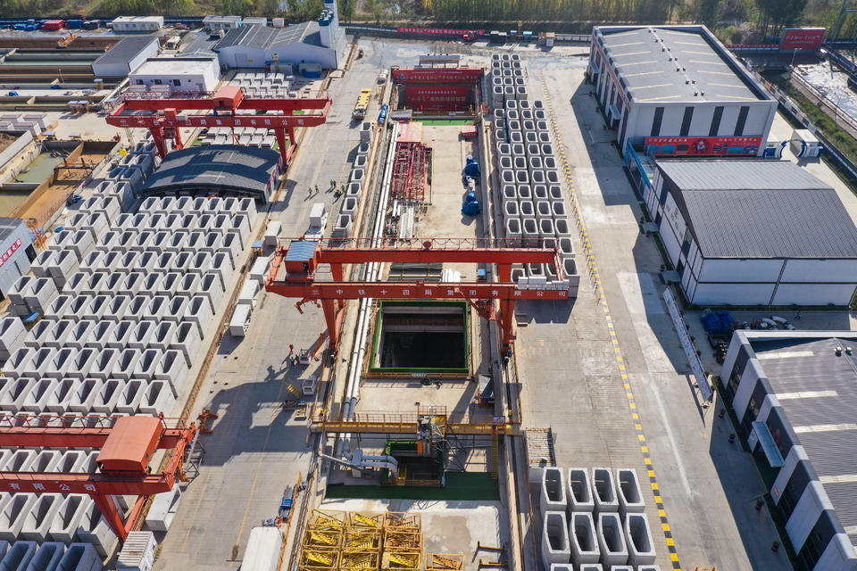 盾构井四周,大量的隧道箱涵和管片构件环绕,盾构机发掘出来的泥土在东侧暂存。