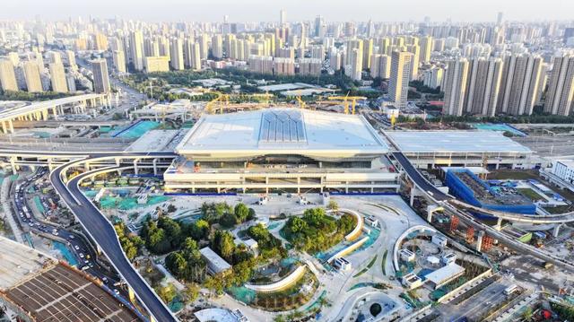 目前,合肥西站的西站房及广场已全面进入收尾阶段施工,除少量绿化、地面铺装及室内装饰收边收口工作外,其余节点均已施工完毕。