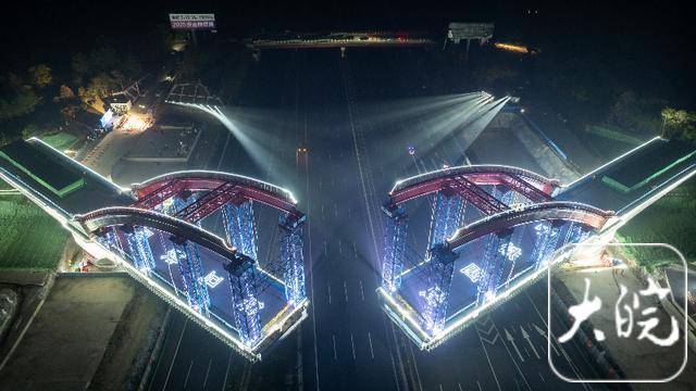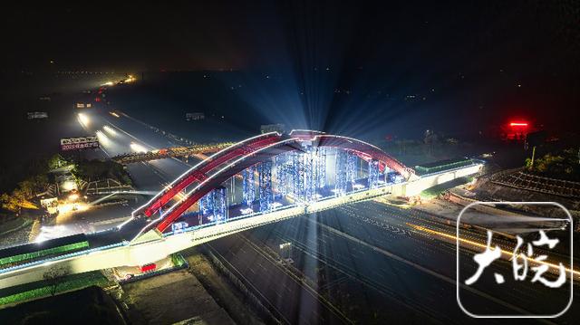 大皖新闻讯记者从中国铁路上海局集团有限公司获悉,11月12日凌晨5点18分,在位于马鞍山市含山县林头镇巢马城际铁路施工现场,跨芜合高速公路特大桥两个单体重达万吨的连续梁T构在平稳旋转98度后,顺利实现“空中转体”,标志着世界首例非对称连续梁带拱转体到位,巢马城际铁路建设取得阶段性进展。