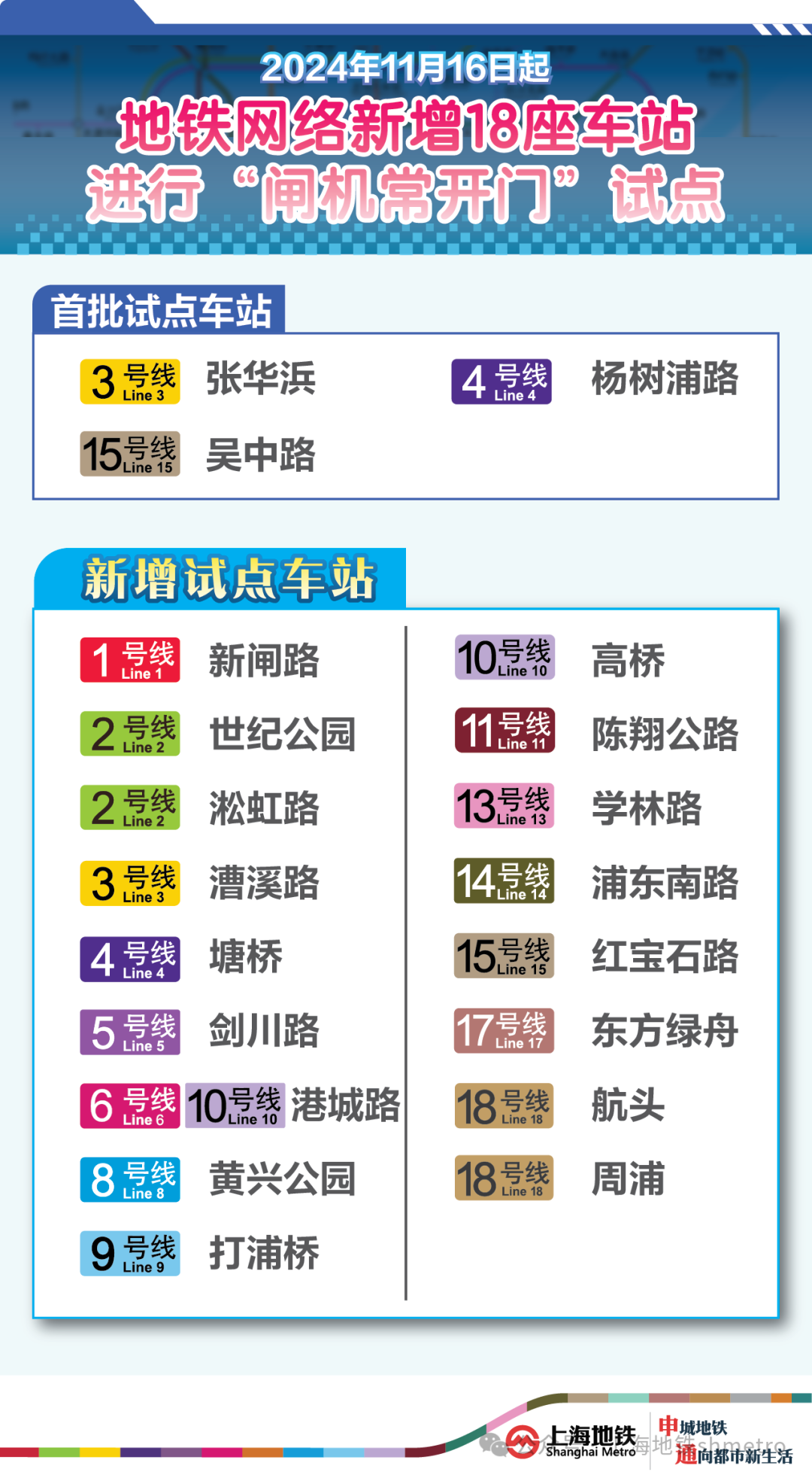 本周六起,上海地铁新增18站试点“闸机常开门”模式。