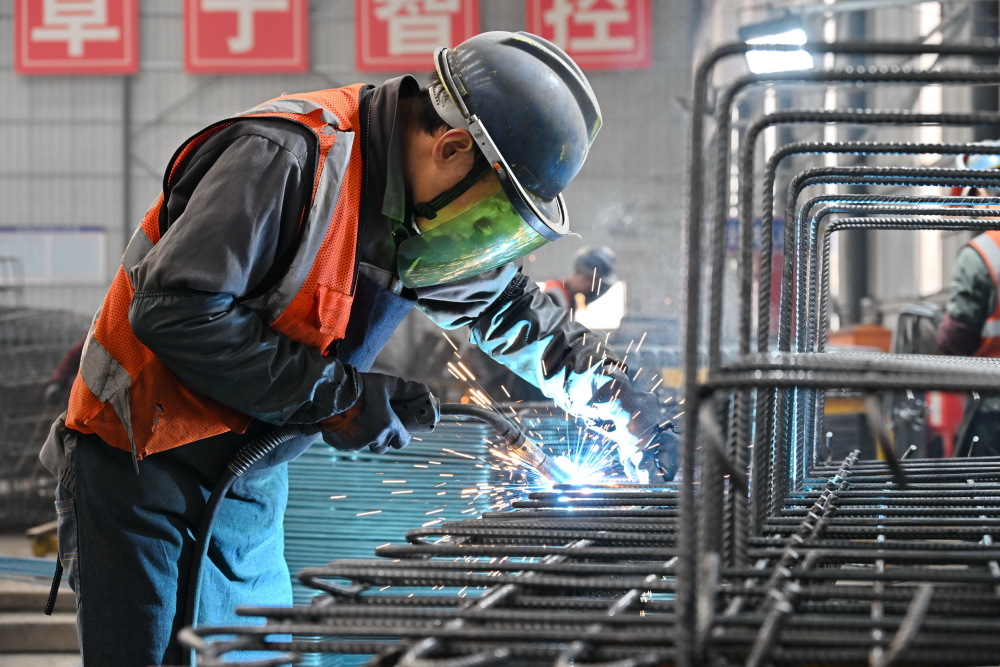 11月19日,中铁十一局集团工人在位于河北省南宫市的雄商高铁站前六标段混凝土构配件智能预制中心内进行焊接作业。新华社记者 牟宇 摄
