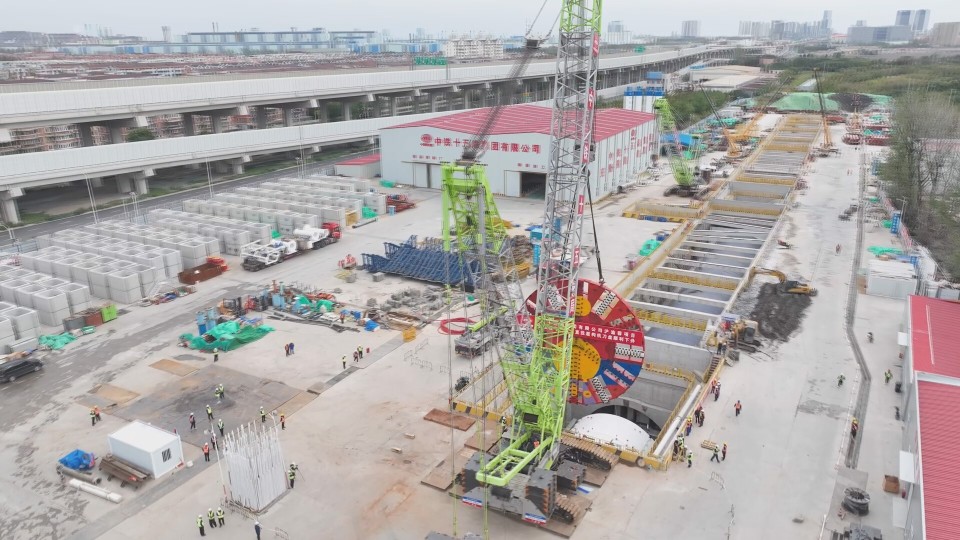 “新征程号”盾构机整机总长101米,最大开挖直径13.5米,重2634吨,装机总功率6500千瓦。此次吊装下井的刀盘重320吨,由1个中心块与6个分块拼装焊接组成,当天,“新征程号”盾构机刀盘在500吨履带吊和350吨履带吊的协同操作与地面作业人员和井下作业人员的密切配合下,通过起吊、翻身、旋转等一系列操作,成功吊装下井,并精准对接在主驱动上。下一步,项目团队将即刻启动管线连接、各系统空载试验和整机联调联试等工作,为后续盾构始发夯实基础。