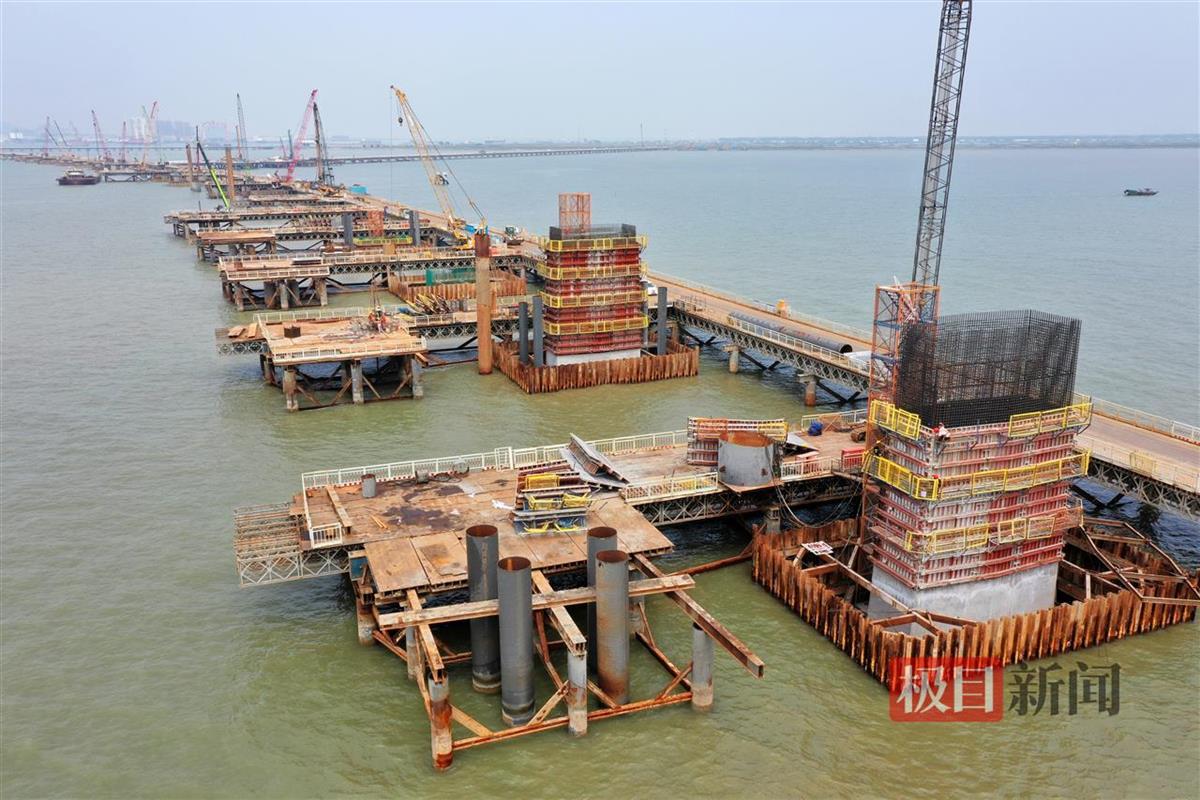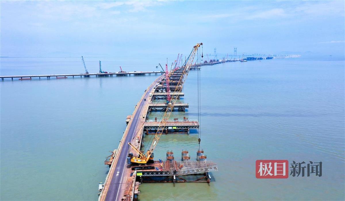 材料、设备、人员如何在跨海桥梁上“立足”呢?结合现场实际,项目团队在紧贴桥位的海面上搭设了一条长约8千米的钢栈桥,将海上施工变陆地施工,降低施工安全风险,提升运输效率。