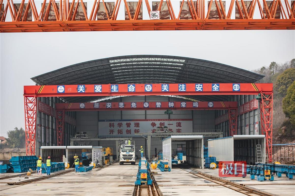 梁场内,极目新闻记者看到,和传统预制梁场不同的是,两座自行走T梁预制混凝土自动布料机“驻扎”现场,一旁设有滑移式轨道。