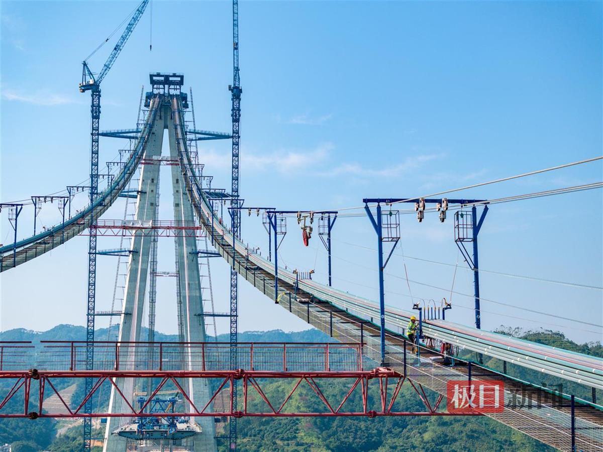 施工高峰期,钢丝在纺丝系统上往复穿梭,看上去就像一座超大型“纺织机”,将施工现场变成主缆索股“加工厂”,仅用时106天就完成主缆施工任务。