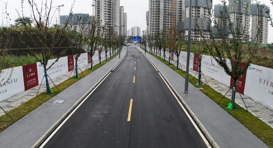 据介绍,在天府中央法务区核心片区,四川天府新区围绕“法治文化、休闲街区”设计理念,布局“六纵八横”,本次完工的3条道路顺利实现打造景观型、开放现代的法务街道。