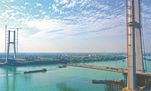 12月4日,在平南至容县高速公路平南特大桥项目现场,工人们正加紧钢箱梁吊装作业,争取早日实现合龙。该桥是广西在建最大跨径斜拉桥,全长2273米,主跨636米,主塔高180米。(陈汝军摄)