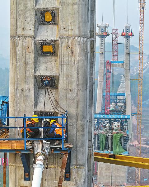 工人正在进行斜拉索的安装工作。成达万高铁公司供图