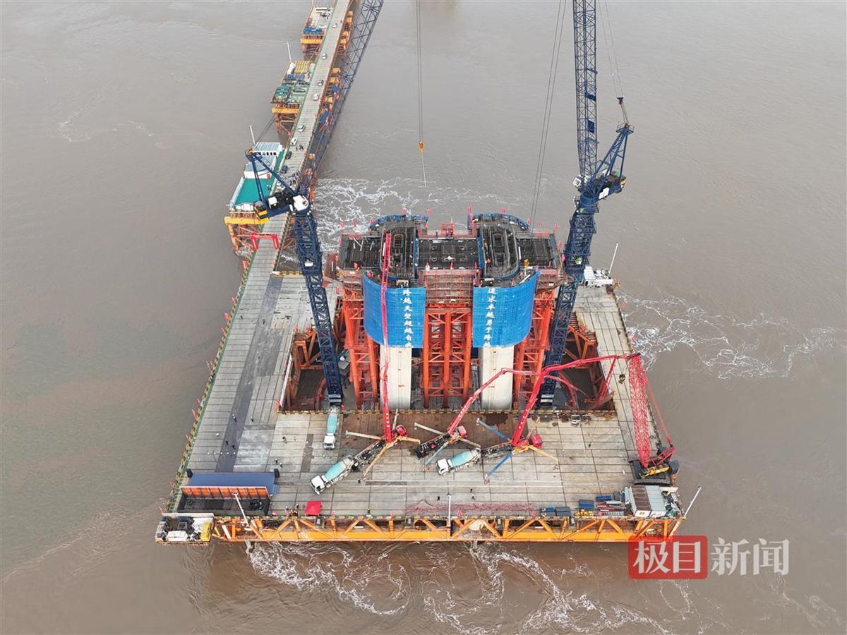 本次浇筑为主塔的下横梁,相当于人的肩膀,后期将与拉索一同承担起钢梁和六线公路以及两线铁路的载重。其中,本次浇筑的模块长44米、宽10米、高8米,共计浇筑混凝土3700方。