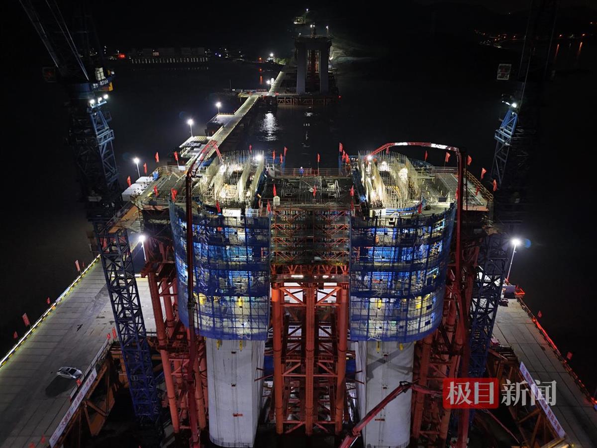 中铁大桥局西堠门公铁两用桥项目党工委书记、常务副经理李永旗说,为保证主塔与下横梁结构的整体性,防止下横梁由于长度大、承载大而容易开裂的风险,在施工中采用下横梁与塔柱同步施工,且一次性浇筑完成。