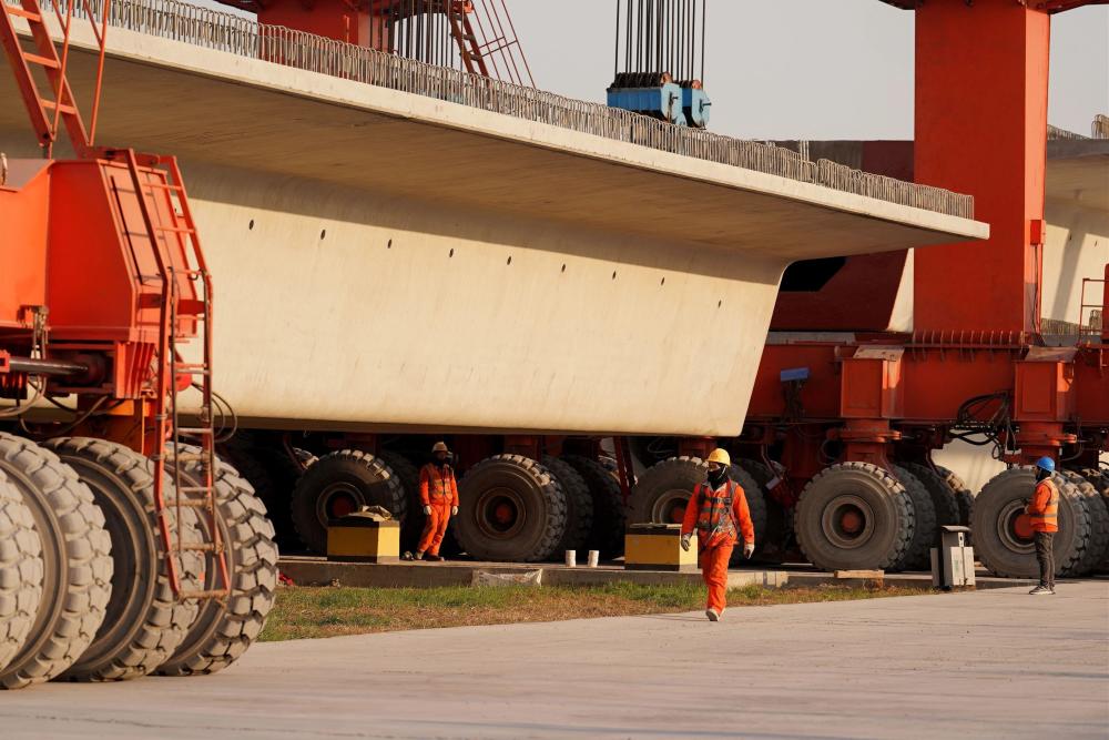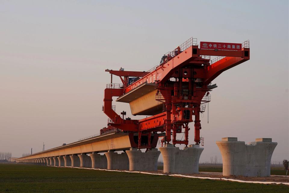 12月20日,中铁二十局工人在河北省邢台市清河县施工现场作业(无人机照片)。新华社记者 邢广利 摄
