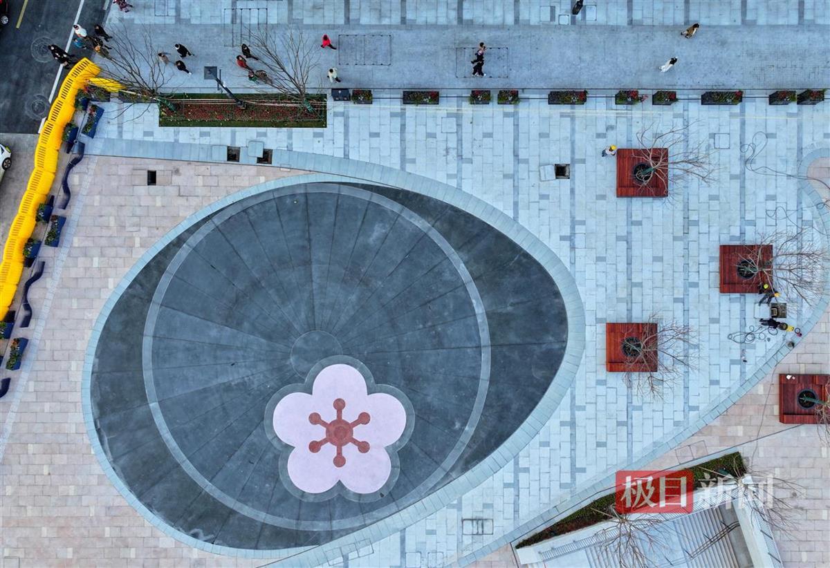 在紧邻南京路的广场区域,一朵绽放着的“市花”梅花巨型图案采用碎小的粉色马赛克拼接而成。“梅花”外围浇筑的深灰色、浅灰色材料反射出星星点点的光芒。