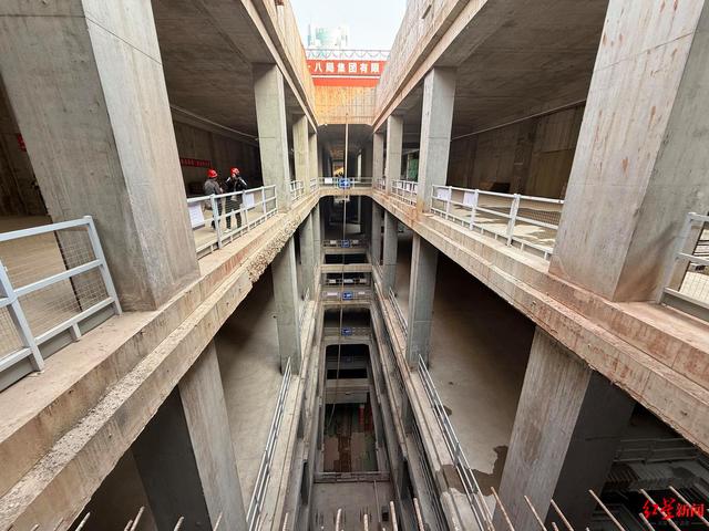 据现场工作人员介绍,骡马市站由新建的18号线三期、10号线车站和已开通运营的1号线、4号线车站组成。作为成都地铁首座4线换乘站,当前建设的基坑地下深度达45.5米、宽度28米、长达180米。