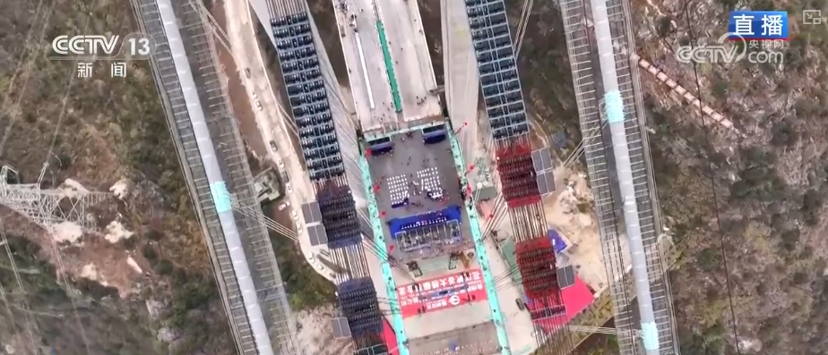 央视网消息:位于贵州省贞丰县和关岭县交界地带的花江峡谷大桥,是贵州六枝至安龙高速公路的重点控制性工程。大桥因跨越被誉为“地球裂缝”的花江大峡谷而得名,大桥全长2890米,主桥跨径1420米,桥面到水面的高度是625米,建成后将成为世界上跨径最大,也是高度最高的山区桥梁。1月17日下午,大桥完成了最后一片钢桁梁的吊装作业,正式合龙。两个世界之最:高度最高跨径最长