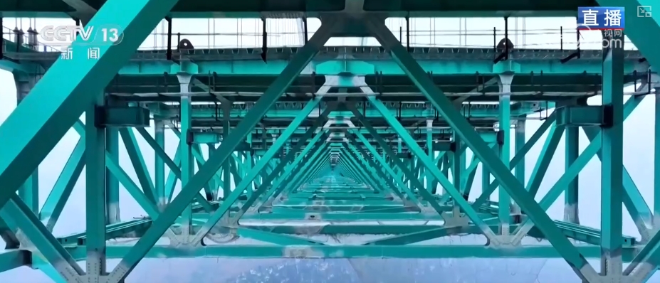 桥面下方的这些蓝绿色的部件是大桥的钢桁梁,一共有93块。从2024年11月4日开始,从大桥中间依次向两个主塔方向进行钢桁梁吊装。2025年1月17日,在贞丰县这一侧完成最后一块钢桁梁的吊装作业。