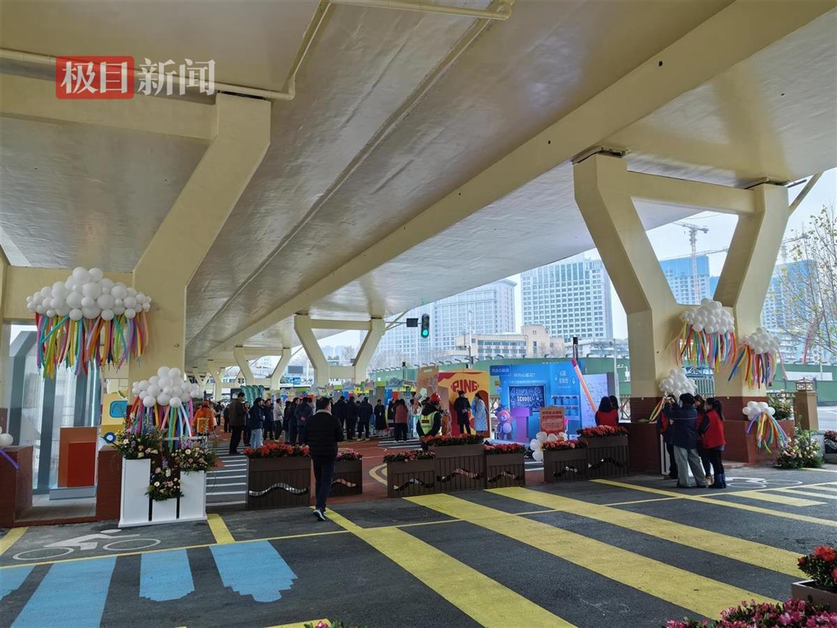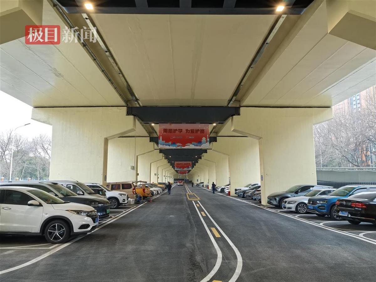 极目新闻记者看到,桥下空间的墩柱和桥顶部位涂上了米黄色的涂料,营造暖色氛围;地面的塑胶场地设有三种颜色,防滑且方便运动;现场的停车区地面平整且画上了停车标线;便民护学岛区域设有便民护学岗、护学通道及各类学生服务摊点等。