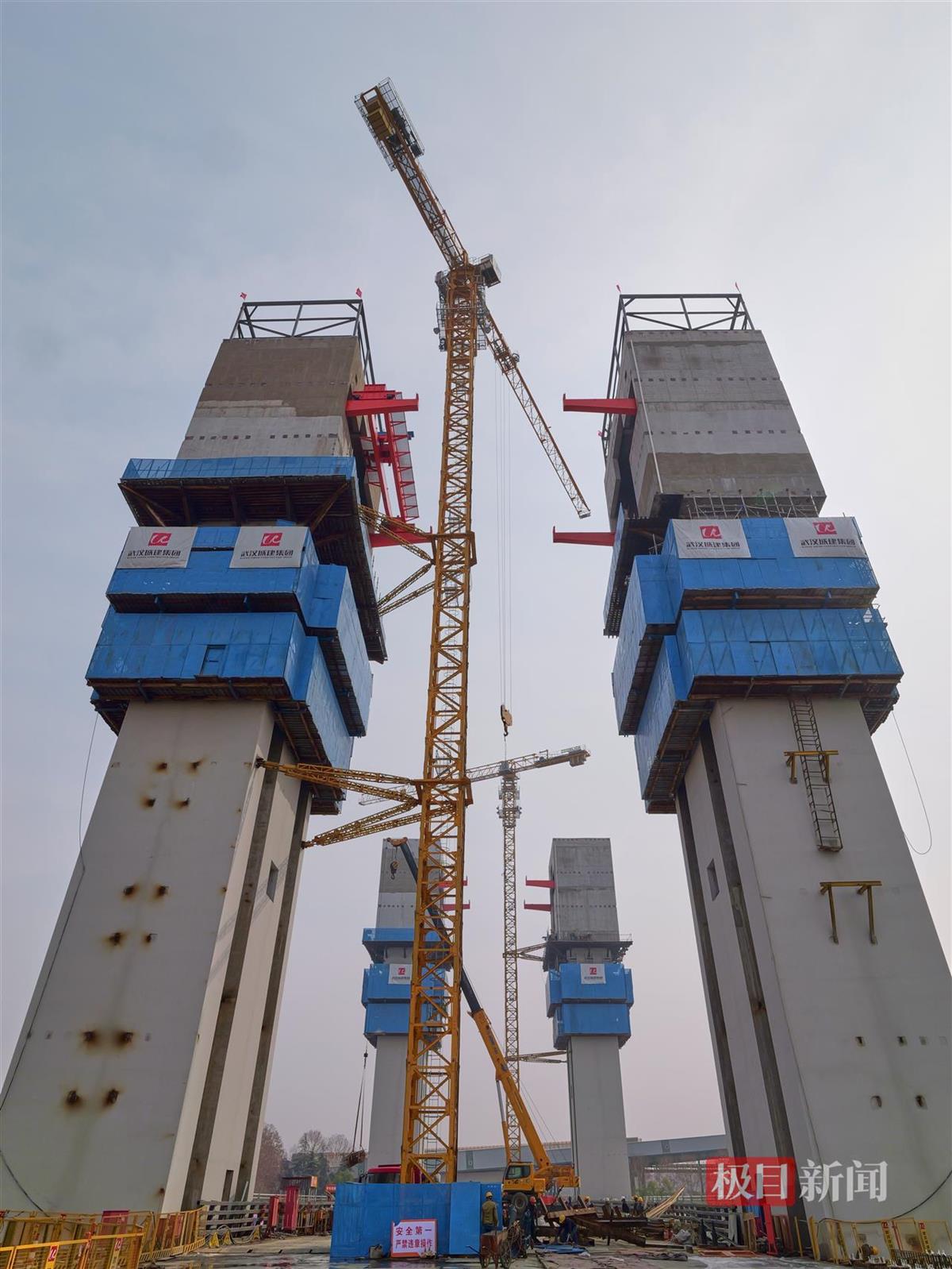2月26日10时许,极目新闻记者驱车经桥面引桥进入现场。记者现场看到,开启桥7号墩和8号墩各设置了1座塔吊。在4座主塔结构中部,蓝色防护网格外显眼,工人们逐步松解螺丝,有序拆卸模板和支架......