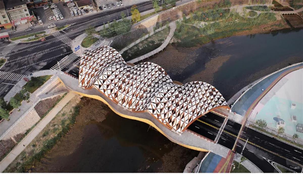 2024年建成的鸽子花桥总建筑面积1882.33平方米,创设了一个依托传统桥梁的“廊”空间,同时将建筑中的 “灰空间”概念引入桥梁设计,营造出别具一格的体验效果。
