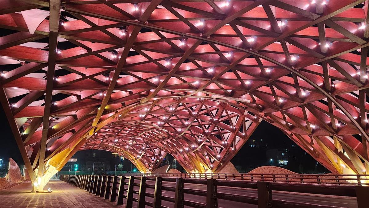 在建筑细部,为增强桥梁的稳固性与美观性,鸽子花桥融合传统美学与现代工程技术,主体结构采用现代木结构框架体系,木材主要为胶合木,上覆PTFE膜,并采用竹篾条编织桥身的曲面围合。