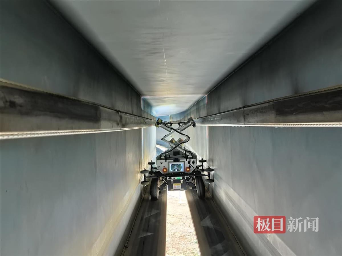 极目新闻记者注意到,智能检测机器人配有高清摄像头和多种传感器,机身为白色、有4个车轮和4个滑移装置,通过箱梁内部环境3D绘图和实时回传。巡线工作中,工作人员通过后台电脑可远程实时监控机器人在巡检运行中的相关数据,以便及时掌握检修情况。