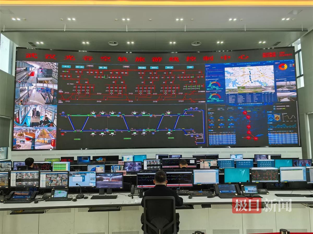7日11时,在光谷空轨旅游线控制中心内,多名工作人员在值班室内紧盯眼前办公电脑和智慧大屏,实时注意空轨6个站点客流及列车上的载客情况。