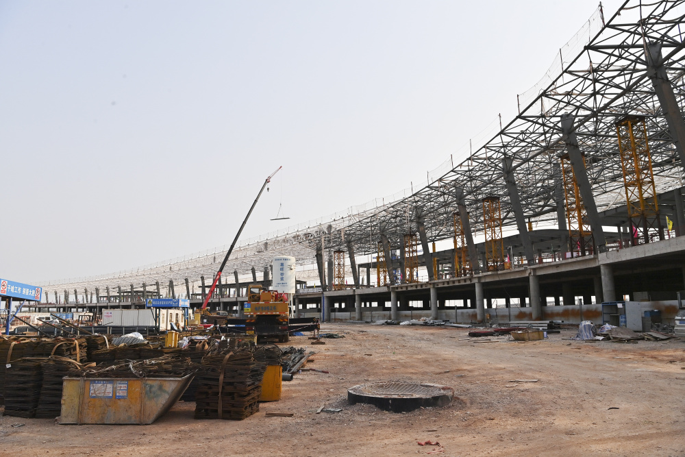 4月2日,工程车辆在南宁吴圩国际机场T3航站楼中央区钢结构屋盖施工现场吊装建材。新华社记者 周华 摄