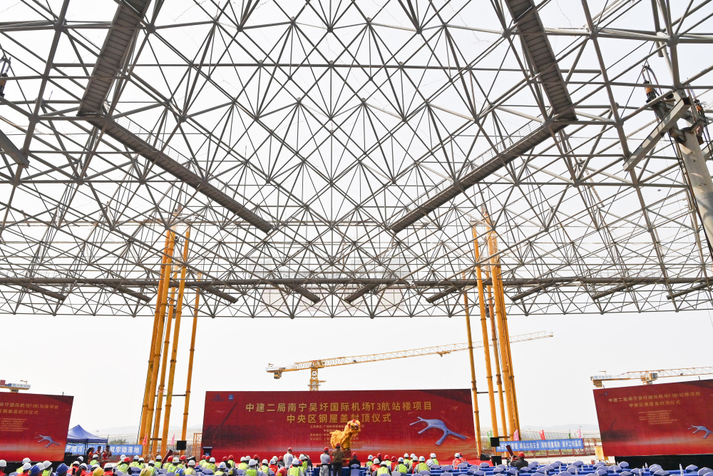 这是4月2日拍摄的南宁吴圩国际机场T3航站楼中央区钢结构主体封顶仪式现场。新华社记者 周华 摄