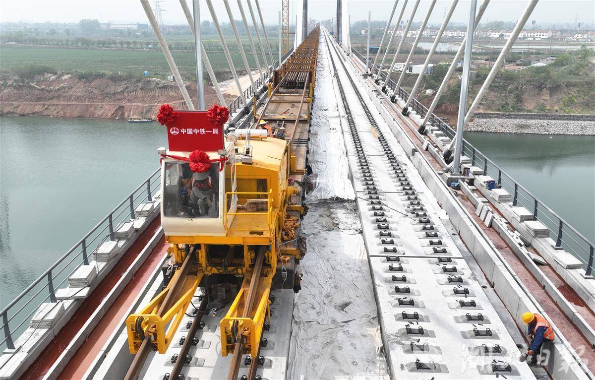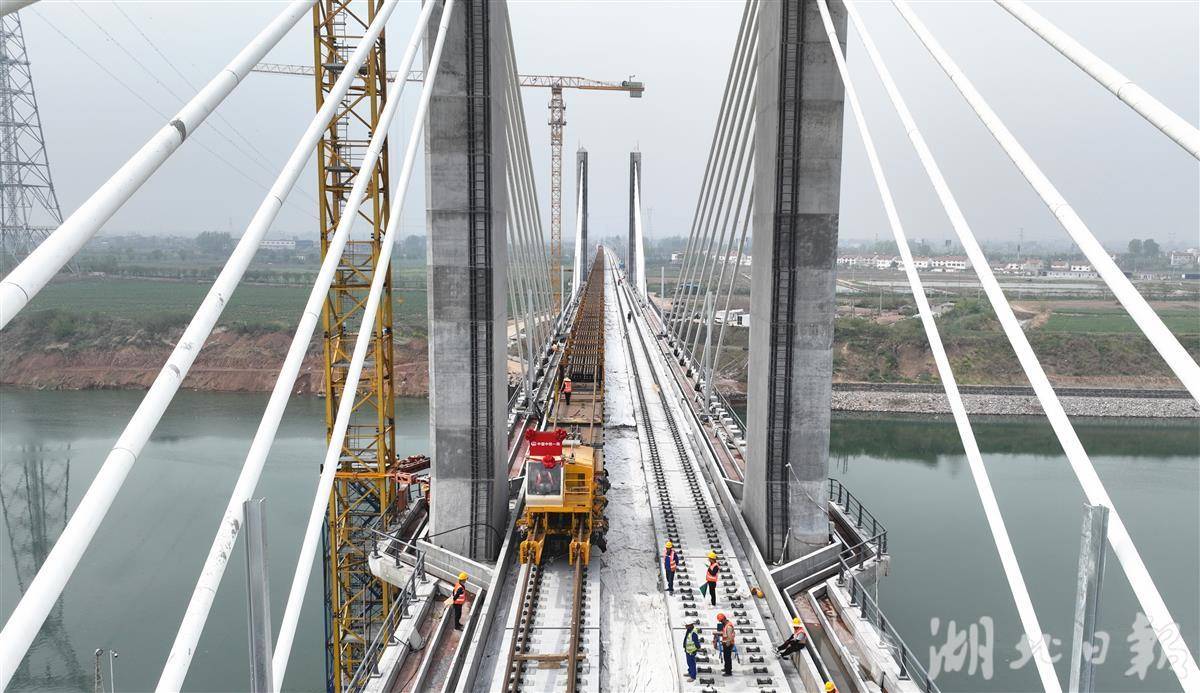 湖北日报讯(记者褚楠、通讯员马春龙)4月9日,在襄荆高铁宜城汉江特大桥铺轨现场,500米长的钢轨被铺轨机精准铺设到无砟轨道床上,标志着襄荆高铁襄阳段正式进入铺轨阶段。