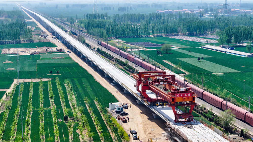 4月15日,在雄商高铁山东省济宁市梁山段,中铁十局的工作人员在进行箱梁架设作业(无人机照片)。新华社记者 郭绪雷 摄