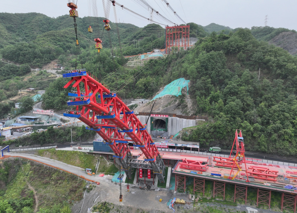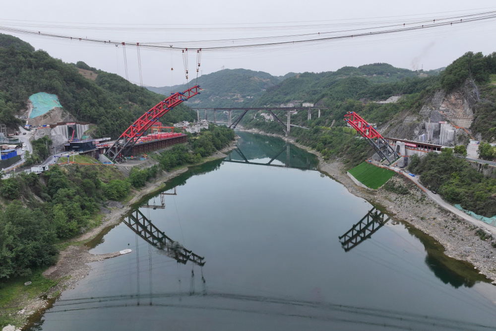 4月29日拍摄的西渝高铁安康汉江大桥钢拱安装建设现场(无人机照片)。新华社记者 邵瑞 摄