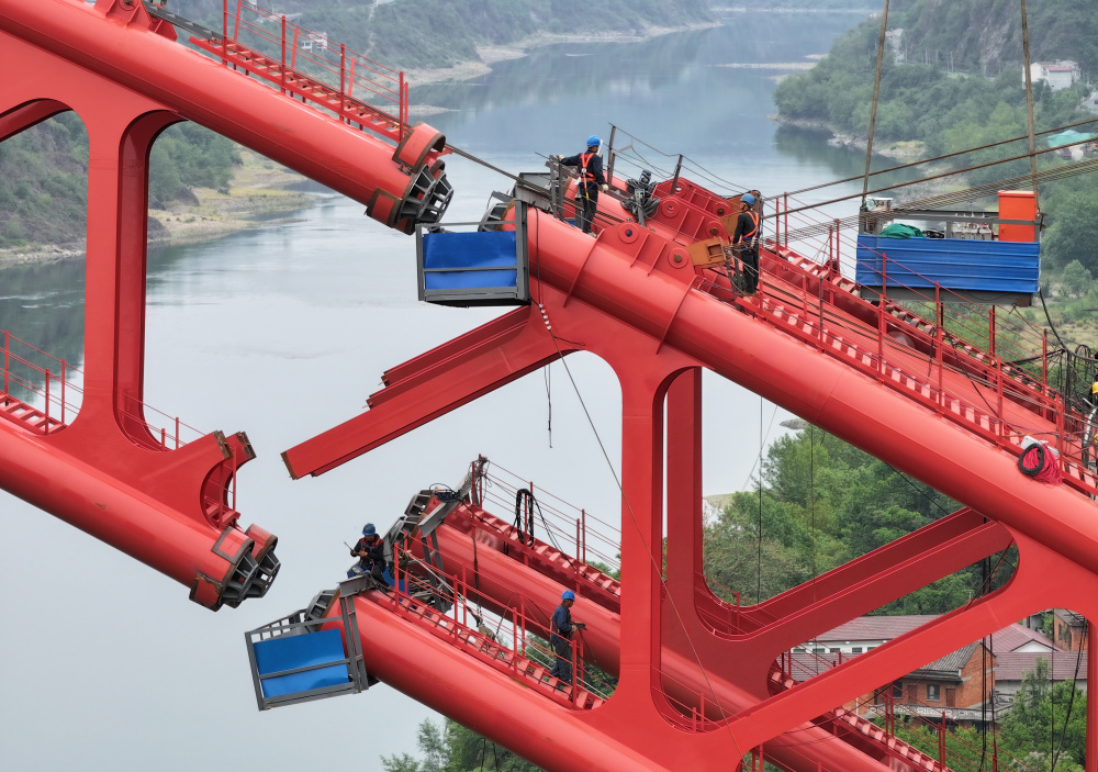 4月29日,工人在西渝高铁安康汉江大桥建设现场进行钢拱安装作业(无人机照片)。新华社记者 邵瑞 摄